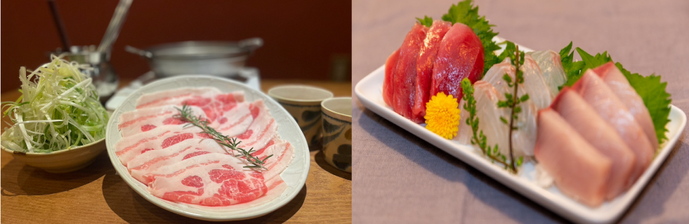 メインの「あぐー葱しゃぶ」以外も 充実!新鮮なお刺身三点盛りや県産食材を使った料理も!マグロは生マグロ(冷凍されていない)です!